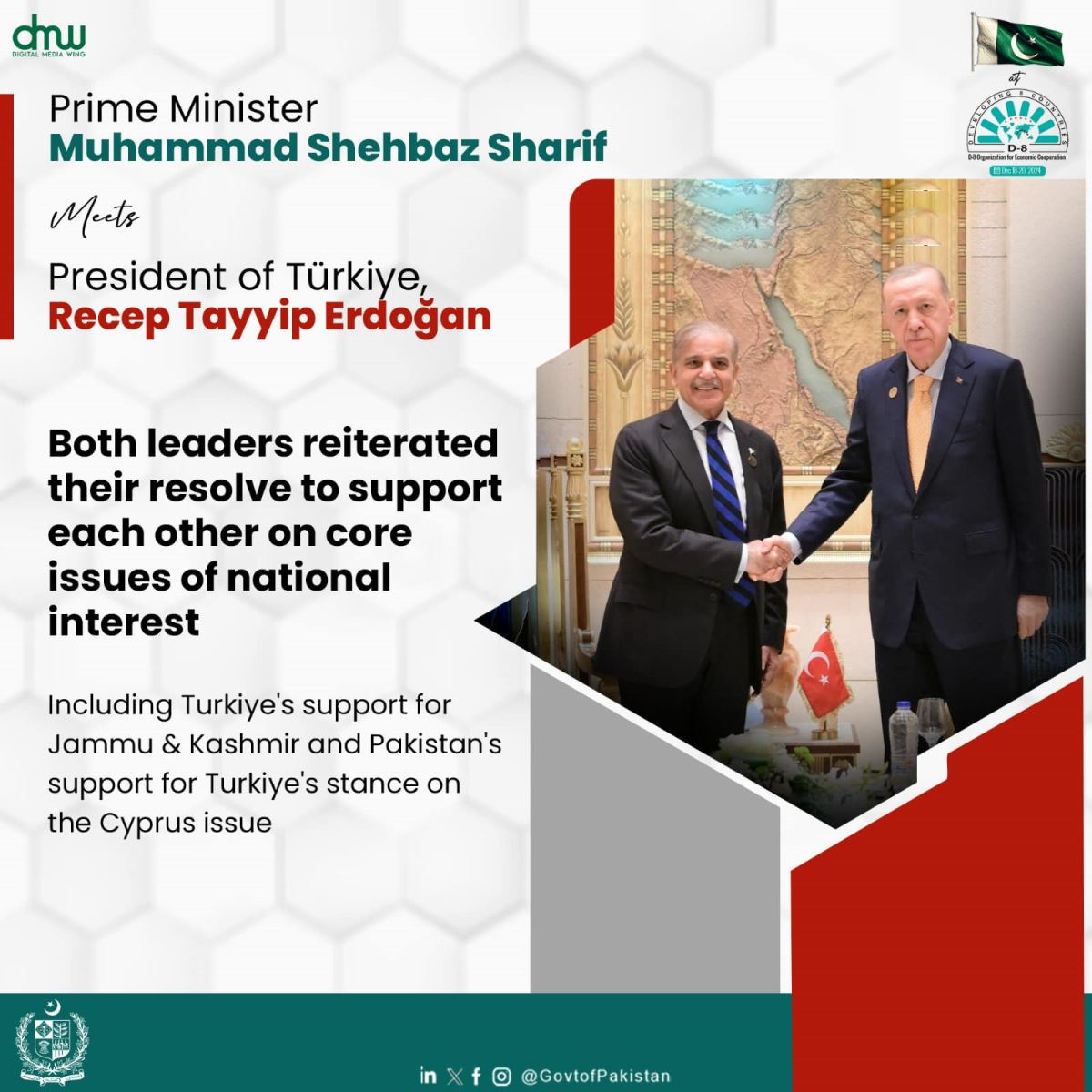 Prime Minister Muhammad Shehbaz Sharif held a bilateral meeting with President of Türkiye, H.E. Recep Tayyip Erdogan on the sidelines of the 11th D-8 Summit in Cairo.