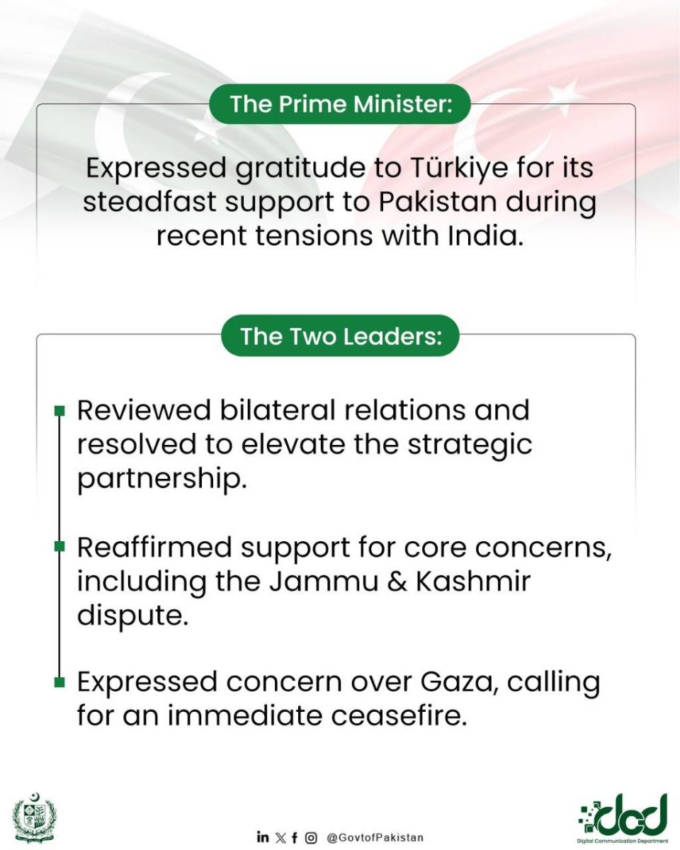 Prime Minister expressed heartfelt gratitude to the Government and people of Türkiye for their unwavering support to Pakistan during the recent developments in South Asia. The two leaders reviewed progress on the implementation of key decisions taken during the 7th session of the High-Level Strategic Cooperation Council (HLSCC). They reaffirmed their shared resolve to raise bilateral trade to the targeted level of USD 5 billion annually, as agreed earlier. Discussions also focused on key regional and global issues. Both leaders reaffirmed mutual support for each other’s core concerns including the Jammu and Kashmir dispute. The meeting concluded with a renewed commitment to deepening the multifaceted cooperation between Pakistan and Türkiye.