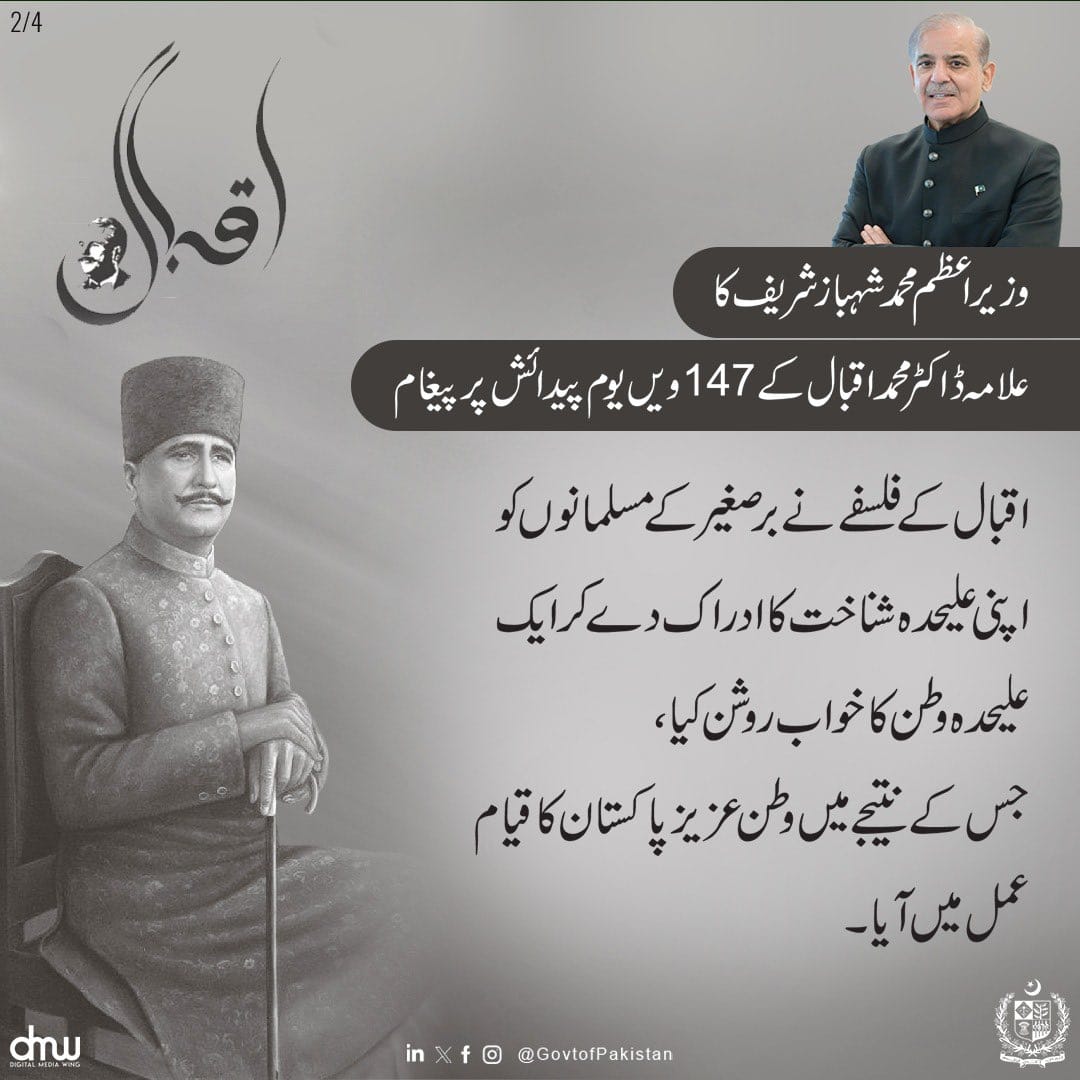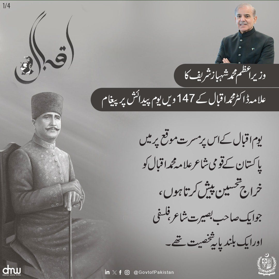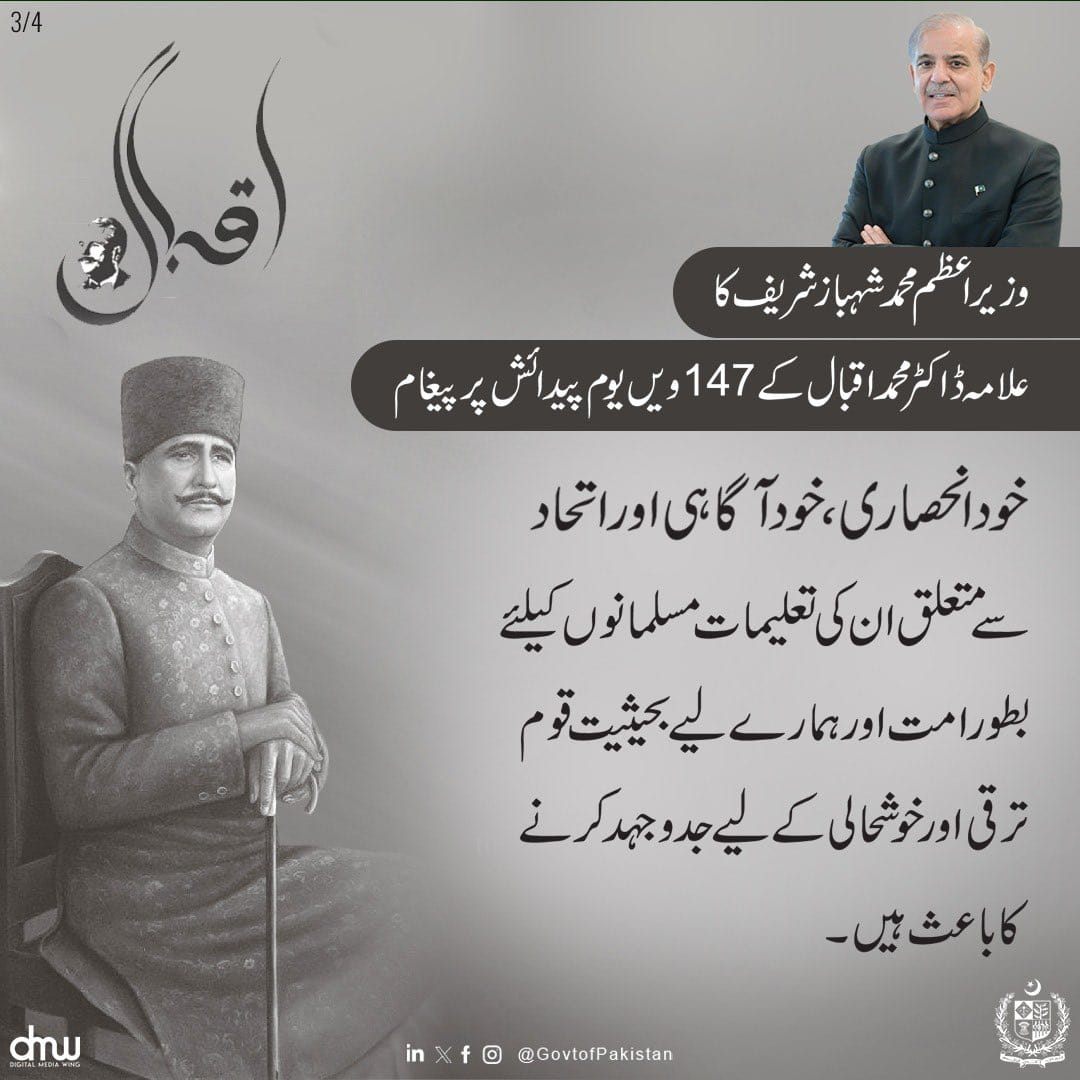 Prime Minister Muhammad Shehbaz Sharif's Message on 147th Birth Anniversary of Allama Dr. Muhammad Iqbal